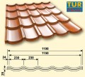 МеталикМеталлочерепица TUR Classic (ТУР Классик) внешне напоминает классическую черепицу и производится в виде листов, порезанных согласно индивидуальным размерам заказчика. Она относится к кровельным материалам премиум сегмента, так как представляет собой оцинкованный с двух сторон лист металла европейского производителя.
